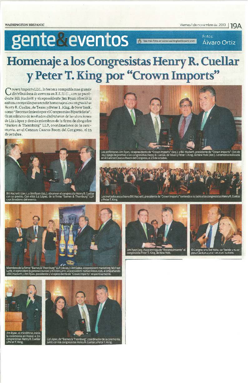 Homenaje a los Congresistas Henry R. Cuellar y Peter T. King por "Crown Imports"
