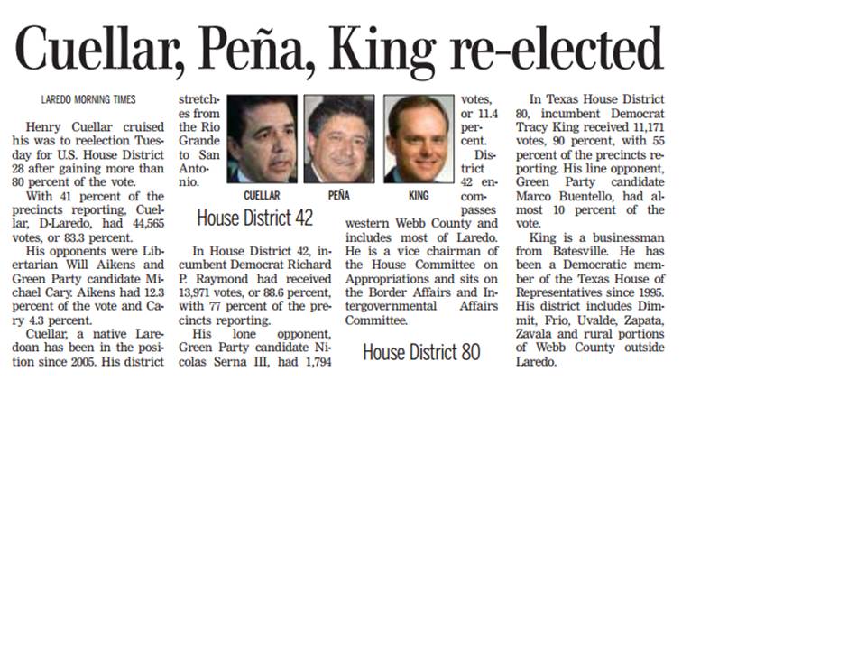 Laredo Morning Times: Cuellar, Peña, King re-elected