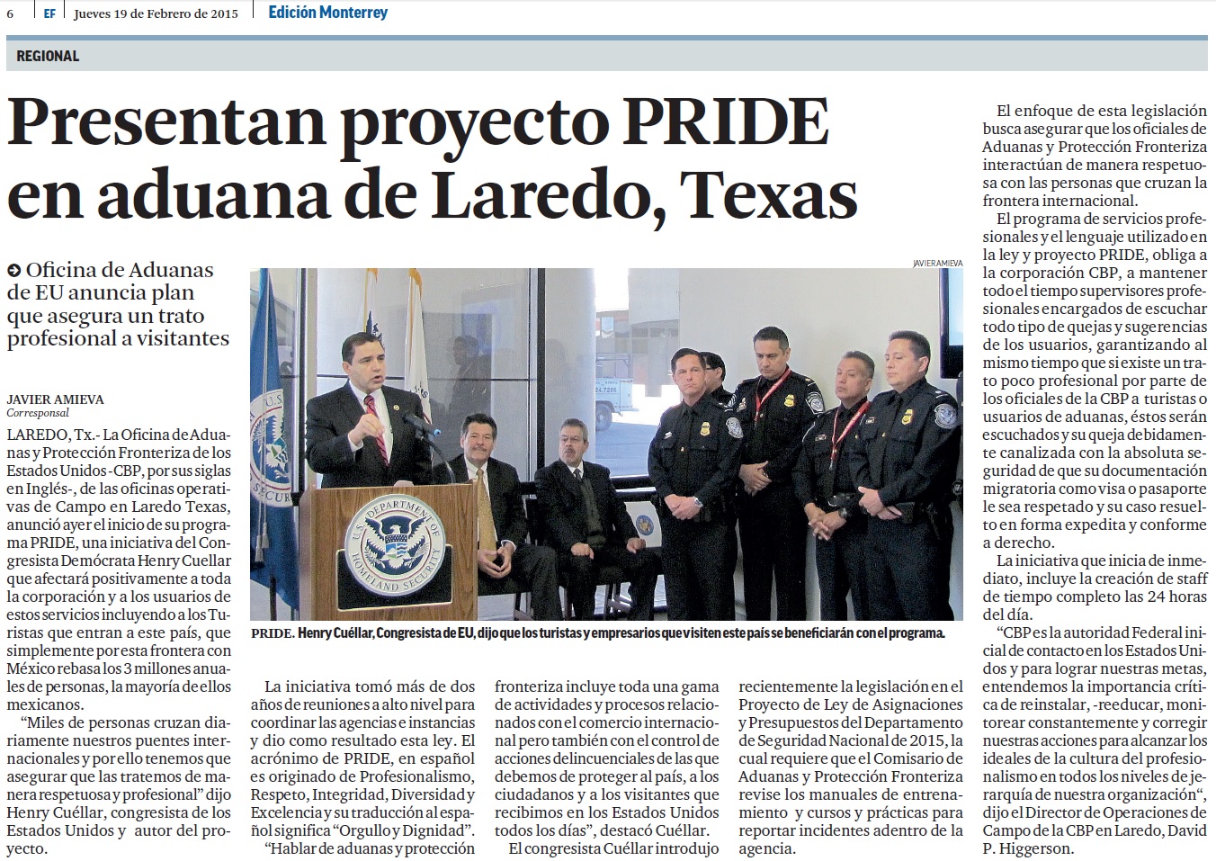 El Financiero: Presentan proyecto PRIDE en aduana de Laredo, Texas