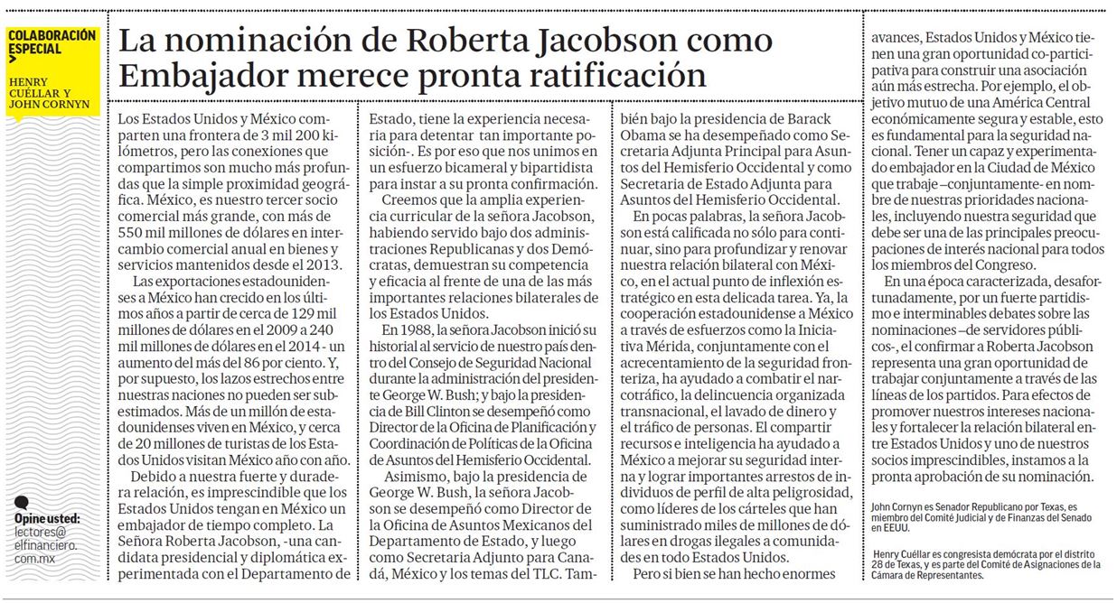 EL FINANCIERO: La Nominacion de Roberta Jacobson Como Embajador Merece Pronta Ratificacion