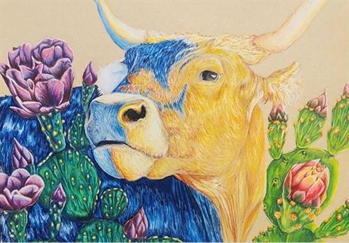 Description: Blue and yellow textured bull with cactus with purple flowers on the left and cactus with pink flowers on the right.